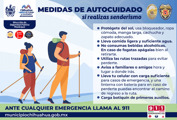 Durante el período vacacional, los chihuahuenses visitan sitios para practicar deporte o recreación en cerros, al igual que presas y parques alejados de la mancha urbana, por lo cual, el Gobierno Municipal a través de la Dirección de Seguridad Pública, emite recomendaciones para evitar incidentes que en ocasiones derivan en lesiones de gravedad o extravíos.