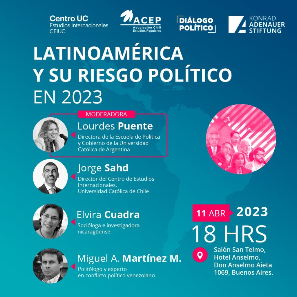 La Fundación Konrad Adenauer, Diálogo Político, ACEP Argentina y el Centro de Estudios Internacionales de la Universidad Católica de Chile, invitan a un conversatorio sobre Latinoamérica y su riesgo político.