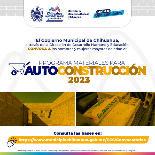 El Gobierno Municipal que encabeza el alcalde Marco Bonilla, a través de la Dirección de Desarrollo Humano y Educación, invita a las familias que se encuentren en situación de vulnerabilidad, que necesiten ampliar o mejorar su vivienda, a participar en el programa de Materiales de Autoconstrucción 2023.