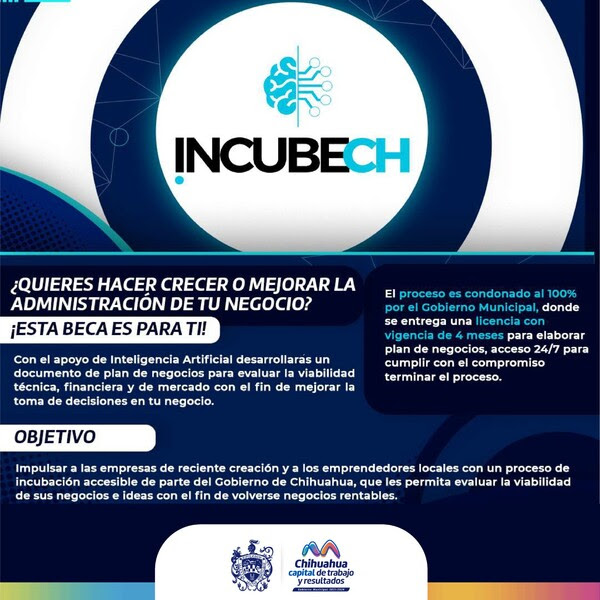 El Gobierno Municipal de Chihuahua, encabezado por el alcalde Marco Bonilla, invita a las y los ciudadanos a participar en el programa de becas para emprendedores locales en la Incubadora de Empresas del Municipio de Chihuahua (INCUBECH), donde se brinda la oportunidad de llevar a cabo un plan de negocios y su validación mediante el uso de inteligencia artificial, lo cual permite superar la etapa difícil de los emprendimientos y convertir sus ideas en un negocio exitoso.