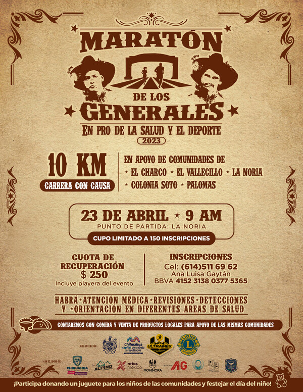 El Gobierno Municipal, que encabeza el alcalde Marco Bonilla, a través de la Secretaría del H. Ayuntamiento, en coordinación con las Regidoras y Regidores, invita a participar en el “Maratón Los Generales”, el próximo domingo 23 de abril a las 9:00 am, la cual es una carrera deportiva con causa de 10 kilómetros que beneficiará a las comunidades de El Charco, El Vallecillo, La Noria, Colonia Soto y Palomas.