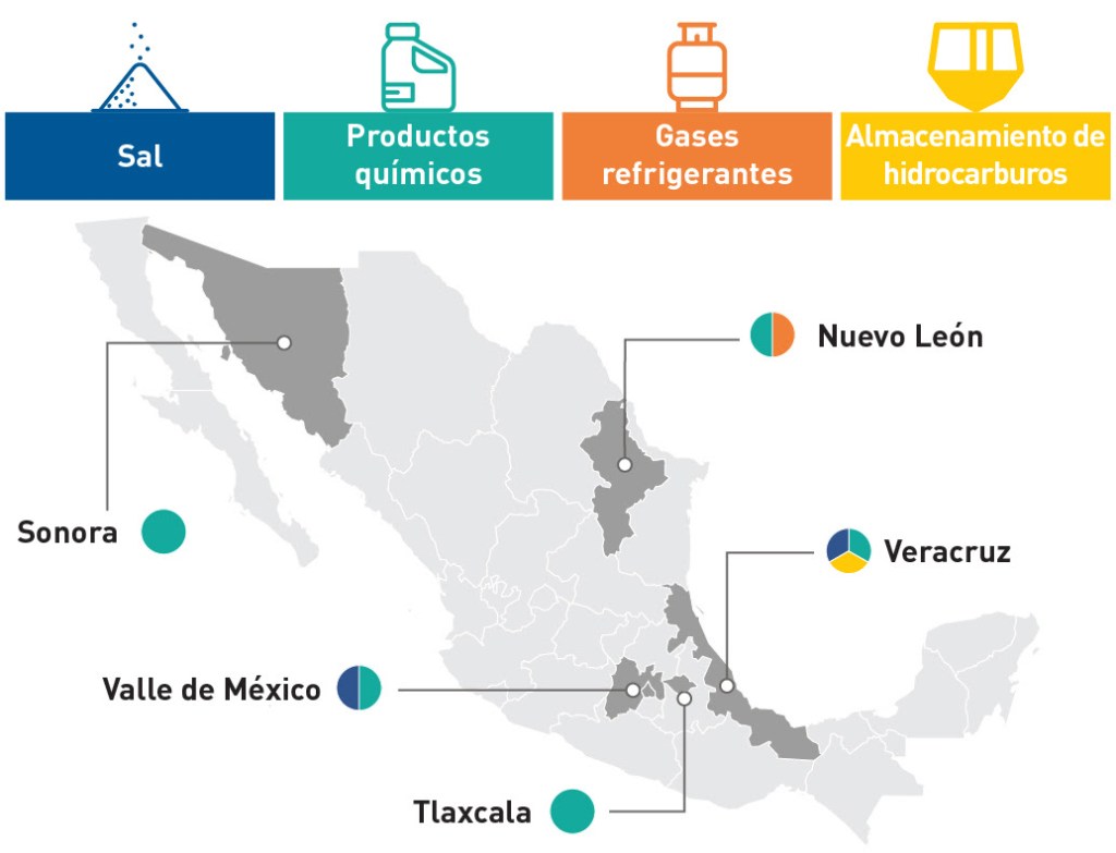 - Más recientemente, ha aprovechado las cavernas salinas que ya llegaron al fin de su vida útil para almacenar gas natural y gas LP.