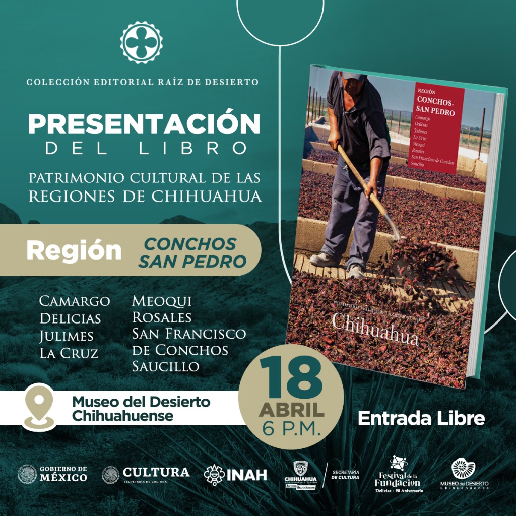Este martes 18 de abril en punto de las 18:00 horas, en el Museo del Desierto Chihuahuense (MUDECh) de la ciudad de Delicias, se llevará a cabo la presentación del libro “Patrimonio Cultural de las Regiones de Chihuahua.Región Conchos-San Pedro”.