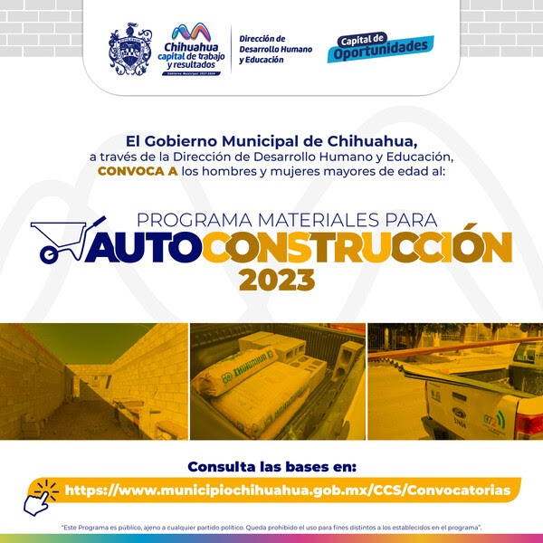 El Gobierno Municipal de Chihuahua, a través de la Dirección de Desarrollo Humano y Educación, invita a las familias que se encuentren en situación de vulnerabilidad, que necesiten ampliar o mejorar su vivienda, a participar en el programa de Materiales de Autoconstrucción 2023.