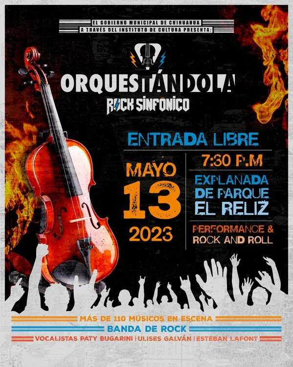 El Gobierno Municipal de Chihuahua, a través del Instituto de Cultura del Municipio (ICM), invita a las familias chihuahuenses a la primera edición de “Orquestándola, Rock Sinfónico”, un concierto de orquesta y banda de rock en conjunto que se llevará a cabo el sábado 13 de mayo a las 7:30 pm en la explanada del parque “El Reliz”.