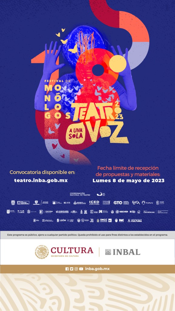 La Secretaría de Cultura Federal en coordinación con la Secretaría de Cultura del Estado, a través del Instituto Nacional de Bellas Artes y Literatura (INBAL), mediante la Coordinación Nacional de Teatro, convoca a la comunidad teatral nacional a participar en el 18° Festival de Monólogos-Teatro a Una Sola Voz 2023.