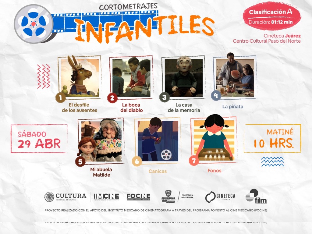 Como parte de las actividades que la Secretaría de Cultura del Estado de Chihuahua realiza en el marco del Día de la Niñez, el sábado 29 de abril a partir de las 10:00 horas, se presentan de forma gratuita, siete cortometrajes nacionales para el público infantil en la Cineteca Juárez, ubicada en el Centro Cultural Paso del Norte.