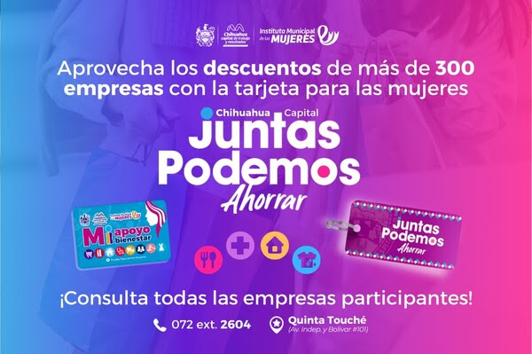 Como parte de las acciones permanentes para contribuir a mejorar la calidad de vida de las mujeres y sus familias, el Gobierno Municipal de Chihuahua encabezado por el alcalde Marco Bonilla, a través del Instituto Municipal de las Mujeres, te invita a conocer los establecimientos que ofrecen descuentos al presentar la tarjeta del programa «Juntas Podemos Ahorrar».