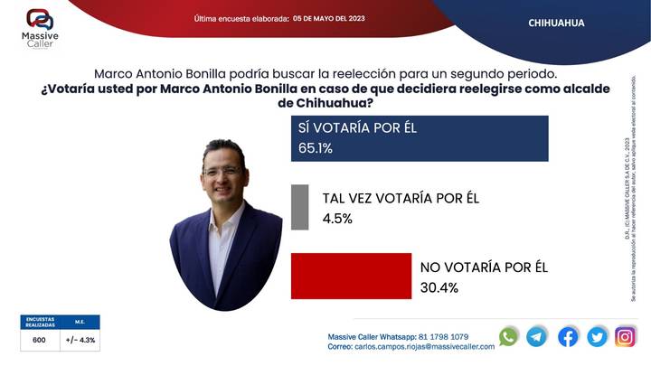 La encuestadora Massive Caller publicó los resultados del último ejercicio de medición de opinión sobre la intención de voto de las personas para la contienda electoral del 2024, para elegir presidente municipal de la ciudad de Chihuahua, en la que un 65.1% de los encuestados respondió que volvería a votar por Marco Antonio Bonilla Mendoza, para reelegirlo en un segundo periodo.