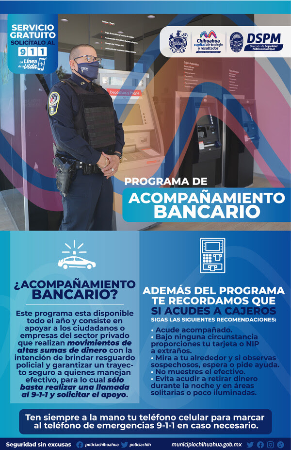 Con el objetivo de asegurar el patrimonio de los chihuahuenses, el Gobierno Municipal, a través de la Dirección de Seguridad Pública (DSPM), ofrece el servicio de “Acompañamiento Bancario”, con la intención de brindar resguardo policial y garantizar un trayecto seguro a quienes manejan efectivo, para lo cual sólo basta realizar una llamada al 9-1-1 y solicitar el apoyo.