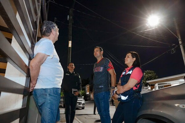 El alcalde de Chihuahua, Marco Bonilla, recorrió las calles de la colonia Junta de los Ríos para supervisar el funcionamiento de las nuevas luminarias con luz LED, también conoció las necesidades de los vecinos en seguridad y servicios.