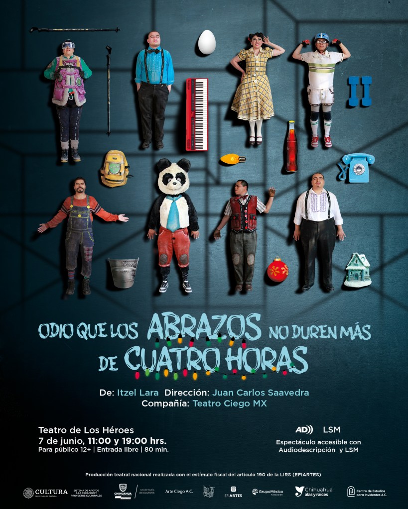 La Secretaría de Cultura de Chihuahua, en coordinación con la compañía Teatro Ciego MX y el Centro de Estudios para Invidentes, A.C. (CEIAC), presentará la puesta en escena “Odio que los abrazos no duren más de cuatro horas”, el próximo 7 de junio en el Teatro de los Héroes de la ciudad de Chihuahua, con dos funciones gratuitas, a las 11:00 y 19:00 horas.