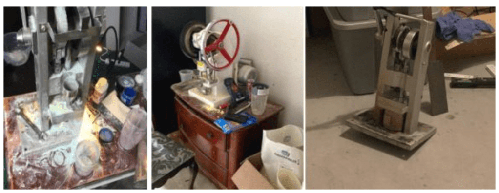 Por otro lado, los moldes son unidades metálicas que se insertan en la prensa y permiten dar cierta forma e impresión a las pastillas. Todo este equipo es regulado por autoridades estadunidenses. Además, si se imprimen marcas registradas con ese equipo y sin autorización, se trata de contrabando.