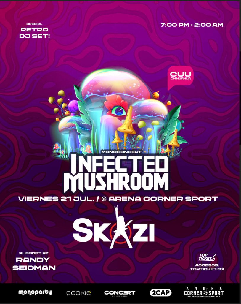 El 21 de julio se presentarán en La Arena Corner Sports los dj de música electrónica Skazi e Infected Mushrooms, con lo que la escena psyco regresa a la ciudad de Chihuahua.