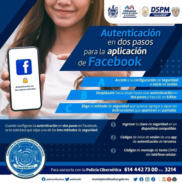 Con el fin de evitar hackeos y engaños en las redes sociales por parte de ciber delincuentes que buscan obtener beneficios monetarios o datos de las víctimas para darles mal uso, el Gobierno Municipal a través de su Policía Cibernética, exhorta a los chihuahuenses a realizar la verificación de dos pasos.