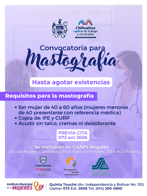 El Gobierno Municipal, encabezado por el alcalde Marco Bonilla, a través del Instituto Municipal de las Mujeres (IMM), invitó a las mujeres a aprovechar la oportunidad de realizarse mastografías de forma gratuita. Esta iniciativa estará disponible desde el lunes 26 hasta el viernes 30 de junio en las instalaciones del Centro Avanzado de Atención Primaria a la Salud (CAAPS) Nogales, situado en la colonia Pedro Domínguez, entre la avenida Los Nogales y la calle Guadalupe Reza.