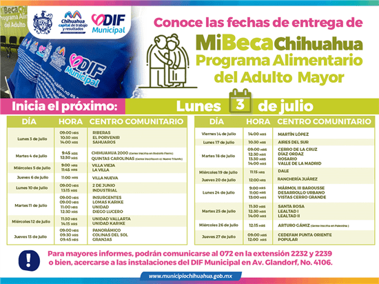 En respuesta al compromiso del alcalde Marco Bonilla con los adultos mayores de Chihuahua Capital, el Gobierno Municipal, a través del DIF, ha anunciado las fechas de la tercera entrega del Programa Alimentario del Adulto Mayor (PAAM) 2023. Esta entrega se llevará a cabo del 3 al 27 de julio en los centros comunitarios municipales, comenzando en la zona norte de la ciudad y concluyendo en la zona sureste.