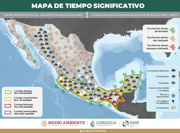 En relación a las precipitaciones esperadas para jueves y viernes, se esperan lluvias dispersas a moderadas (de 5.1 a 25 mm) en municipios como Urique, Morelos y Guadalupe y Calvo.