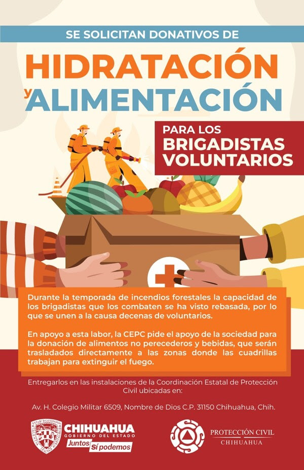 La Coordinación Estatal de Protección Civil expresa su agradecimiento por el apoyo y la colaboración de los residentes de Chihuahua en esta campaña, que tiene como objetivo brindar el respaldo necesario a los brigadistas y proteger la región serrana de los incendios forestales.