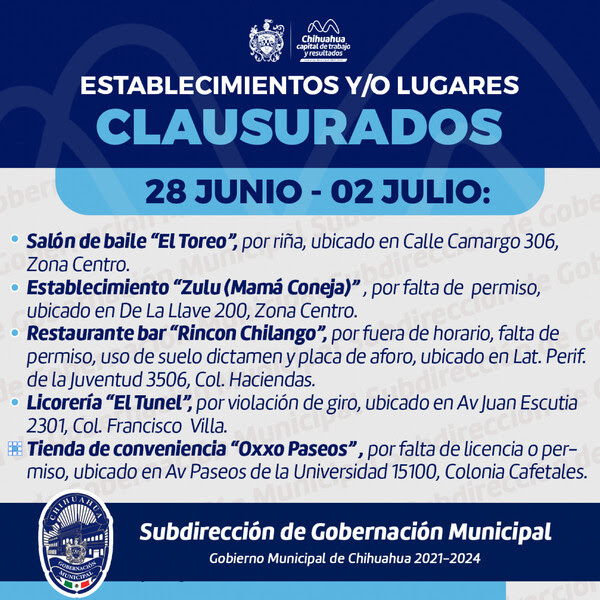 Del 28 de junio al 02 de julio, el Gobierno Municipal de Chihuahua, a través de la Subdirección de Gobernación de la Secretaría del Ayuntamiento, llevó a cabo un total de 133 inspecciones a locales y establecimientos. Como resultado de estas acciones, se clausuraron cinco establecimientos y se levantaron 26 actas administrativas por diversas razones.
