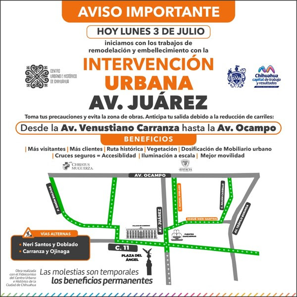 Como parte de los compromisos del alcalde Marco Bonilla con los ciudadanos de la Capital de Chihuahua, el Gobierno Municipal, a través del Consejo de Urbanización Municipal y en colaboración con el Fideicomiso del Centro Urbano e Histórico de la ciudad, da comienzo hoy a los esfuerzos de remodelación y embellecimiento del Centro Histórico. Estos trabajos se iniciarán con la renovación de cuatro aceras de la avenida Juárez.