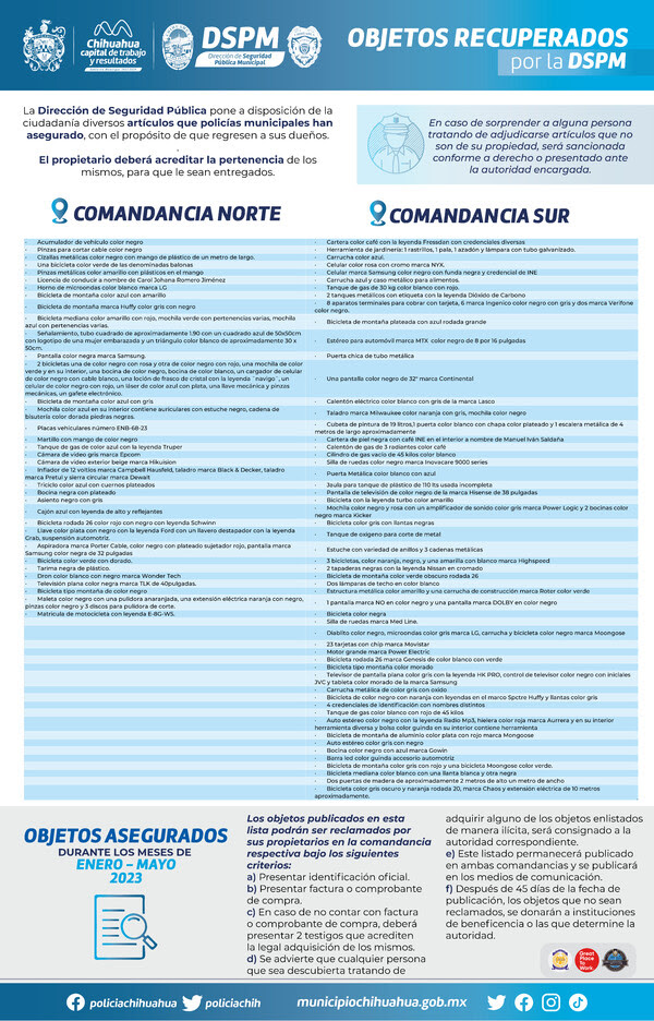 El Gobierno Municipal invita a los propietarios de objetos robados que han sido asegurados por la Policía Municipal a recuperarlos. Esto se puede hacer acudiendo a revisar los listados correspondientes a los últimos meses, los cuales están disponibles en las áreas de acceso público de las Comandancias Norte y Sur.