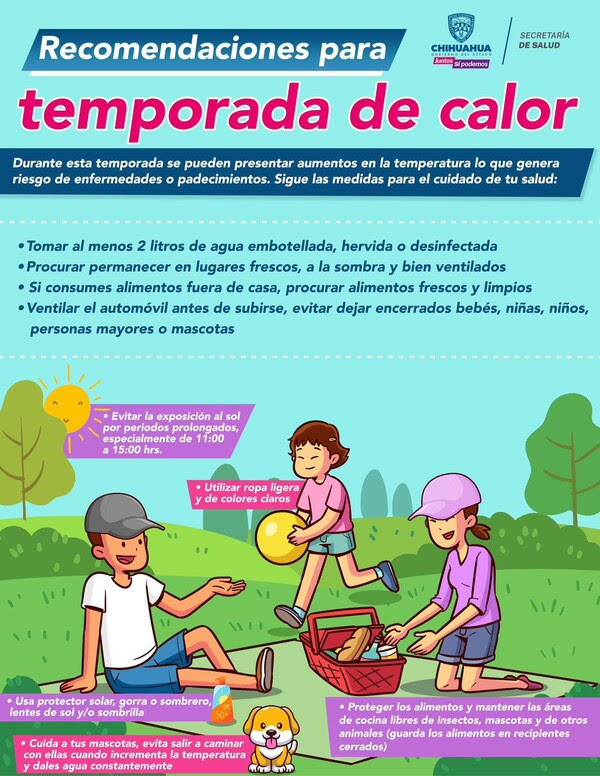 Debido a las altas temperaturas experimentadas recientemente en el estado de Chihuahua, ha habido un aumento en los casos de personas afectadas por quemaduras solares, insolación, deshidratación y golpe de calor. En respuesta a esta situación, la Secretaría de Salud ha emitido varias recomendaciones para protegerse contra estas enfermedades.