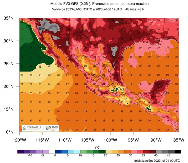 Para el miércoles 5 de julio, se espera que las temperaturas se mantengan en torno a los 38 y 39 grados Celsius en las zonas fronterizas como Juárez, Ojinaga y Janos, mientras que en la región centro sur se esperan máximas por encima de los 30 grados Celsius.