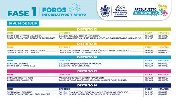 Por otro lado, Mónica Herrera mencionó que se recibirán documentos para participar en el programa desde el 5 de julio hasta el 18 de agosto. Además, informó sobre la realización de foros informativos en una primera fase, que se llevarán a cabo del 10 al 14 de julio. Estos foros tienen como objetivo orientar a la ciudadanía en relación a sus proyectos, y se realizarán dos foros por Distrito.