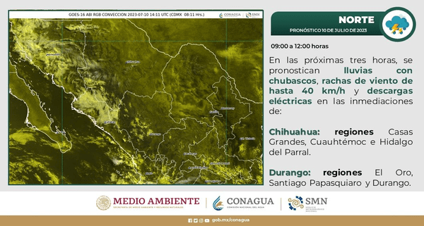 Se esperan lluvias dispersas y de intensidad ligera en Juárez, Ahumada, Guadalupe, Carichí, Chihuahua, San Francisco de Borja, Satevó, Parral, Santa Bárbara, Jiménez, Camargo, Delicias, Aldama y Ojinaga, las cuales podrían estar acompañadas de actividad eléctrica y posible caída de granizo.