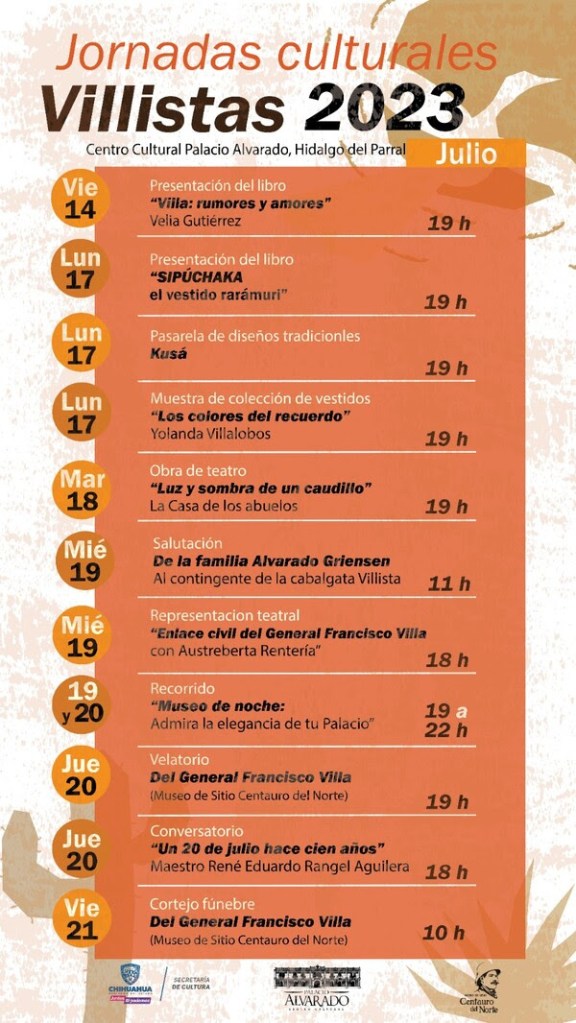 El viernes 14, a las 19:00 horas, se dará inicio a los eventos con la presentación del libro «Villa, Rumores y Amores» de Velia Gutiérrez, que comparte los resultados de una investigación sobre la vida íntima de Doroteo Arango.