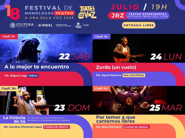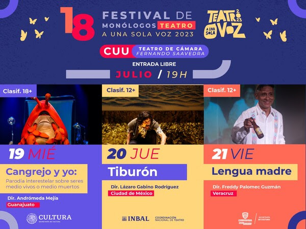 La Secretaría de Cultura de Chihuahua, en colaboración con la Secretaría de Cultura del Gobierno de México y el Instituto Nacional de Bellas Artes y Literatura (INBAL), invita a la 18va edición del Festival de Monólogos – Teatro A Una Sola Voz.