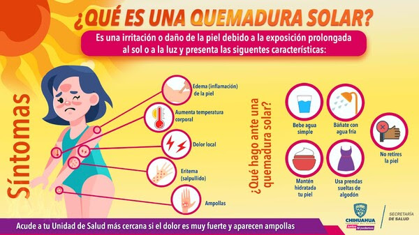 La Secretaría de Salud de Chihuahua hace un llamado a la ciudadanía para tomar medidas preventivas ante los padecimientos relacionados con el calor. Estos incluyen el golpe de calor, quemaduras solares e insolación o deshidratación, que pueden ocurrir por la exposición prolongada al sol.