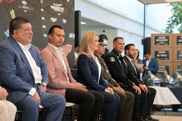 Durante la ceremonia, la Gobernadora entregó uniformes a varias policías municipales y vehículos para presidencias municipales, con el objetivo de fortalecer la seguridad en la región.