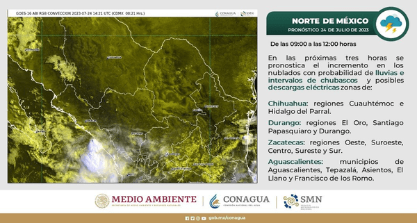 Para el miércoles 26 de julio, se estima la presencia de lluvias dispersas a moderadas con intervalos de chubascos y ráfagas de viento en Guadalupe y Calvo, Temósachic, Moris, Ocampo, Uruachi, Chínipas, Guazapares, Urique, Batopilas y Morelos.