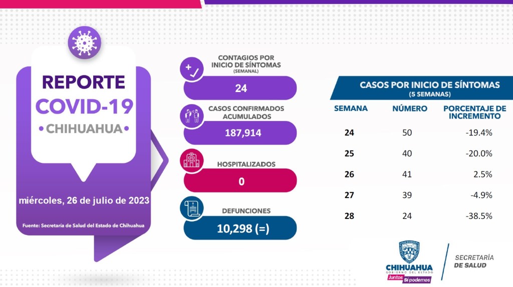El 27 de julio, el Gobierno del Estado, por medio de la Secretaría de Salud de Chihuahua, presentó el reporte actualizado del COVID-19 con datos recopilados hasta el 26 de julio de 2023. Hasta esa fecha, se han confirmado un total de 187,914 casos de COVID-19, con un aumento de 138 nuevos casos desde el último informe emitido el 28 de junio.