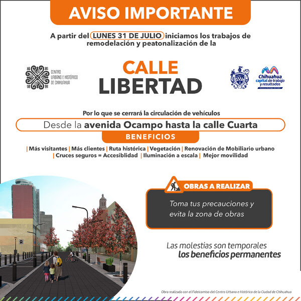 El proyecto se desarrolla en colaboración con el Fideicomiso del Centro Urbano e Histórico de la Ciudad de Chihuahua, con el objetivo de atraer más turistas y clientes a los negocios locales, así como aumentar el flujo peatonal para que las familias de la Capital disfruten de un acceso más libre y seguro. Agradecen la paciencia durante las obras y recuerdan que las molestias serán temporales, pero los beneficios serán duraderos.