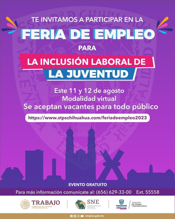 Es importante destacar que la «Feria de Empleo Virtual para la Inclusión Laboral de la Juventud» es un evento gratuito. Para obtener más información, pueden comunicarse a la línea telefónica (656) 629-33-00, extensión 55558, o enviar un correo electrónico a ggalvan@chihuahua.gob.mx.