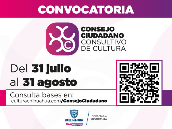 La convocatoria se cierra el 31 de agosto y está dirigida a individuos que sean artistas, creadores, gestores o promotores culturales. Pueden obtener más información en el sitio web culturachihuahua.com/consejociudadano.
