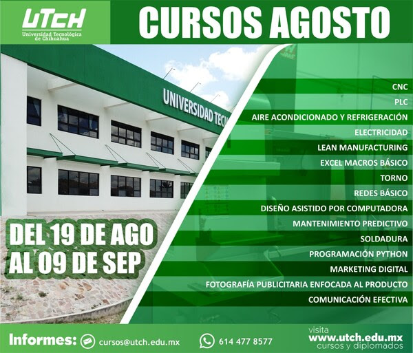 La Universidad Tecnológica de Chihuahua (UTCH) tiene una oferta de cursos y talleres de capacitación dirigidos al público en general, con precios muy accesibles. Estos cursos se llevarán a cabo de manera presencial todos los sábados, desde el 19 de agosto hasta el 9 de septiembre, en un horario de 8:00 a 13:00 horas.