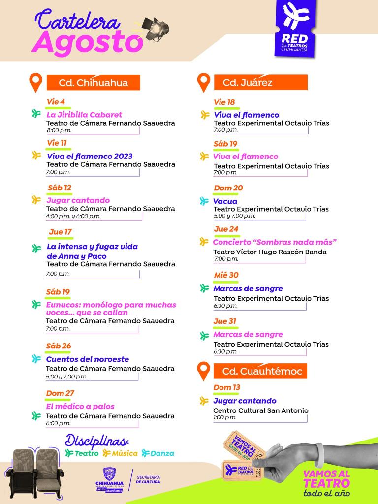Con el objetivo de promover el talento artístico local en el ámbito escénico, la Secretaría de Cultura del Estado de Chihuahua te invita a disfrutar de la programación de la Red de Teatros que estará presente en las ciudades de Chihuahua, Ciudad Juárez y Cuauhtémoc durante el mes de agosto.