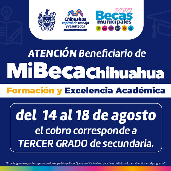 El alcalde Marco Bonilla considera esencial que los niños y jóvenes de Chihuahua Capital sigan estudiando. Por esta razón, la Dirección de Desarrollo Humano y Educación invita a los estudiantes de tercer grado de secundaria que son beneficiarios del programa «Mi Beca Chihuahua Formación y Excelencia 2023» a que cobren su beca del 14 al 18 de agosto.