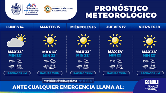 La Coordinación de Protección Civil Municipal de Chihuahua ha anunciado el pronóstico para esta semana, que incluye temperaturas máximas de 34°C y mínimas de 22°C, además de lluvias ligeras a lo largo de la semana.