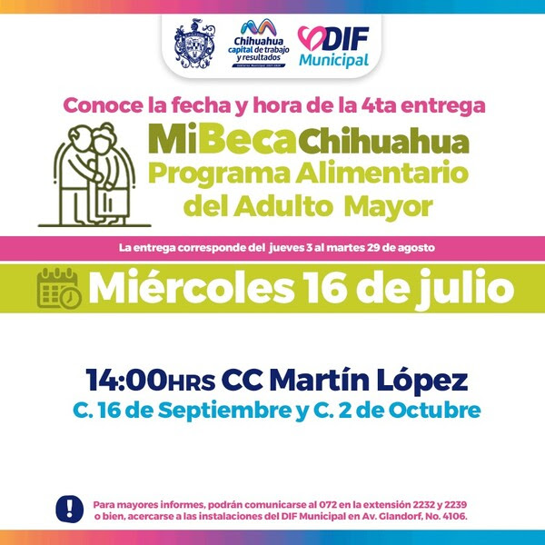 Siguiendo el compromiso del alcalde Marco Bonilla hacia los adultos mayores de Chihuahua Capital para mejorar su calidad de vida, el Gobierno Municipal, a través del DIF, desea informar a los ciudadanos que el próximo miércoles 16 de agosto, los beneficiarios del Programa Alimentario del Adulto Mayor (PAAM) tendrán la oportunidad de recibir su apoyo alimentario en el centro comunitario Martín López, a partir de las 2:00 de la tarde.