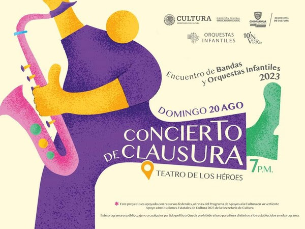 La Secretaría de Cultura del Gobierno del Estado invita a asistir al concierto de Clausura del Encuentro de Orquestas y Bandas Infantiles y Juveniles, con el propósito de fomentar las expresiones culturales y artísticas. El evento tendrá lugar el domingo 20 de agosto a las 19:00 horas en el Teatro de los Héroes, con entrada gratuita.
