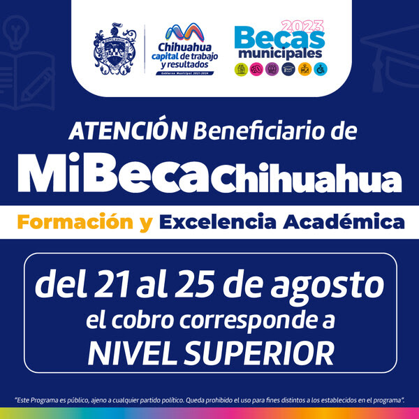 El alcalde Marco Bonilla considera crucial que los niños, niñas y jóvenes de Chihuahua Capital prosigan sus estudios. Por esta razón, a través de la Dirección de Desarrollo Humano y Educación, invita a los estudiantes de nivel superior que son beneficiarios del programa «Mi Beca Chihuahua Formación y Excelencia 2023» a realizar el proceso de cobro.