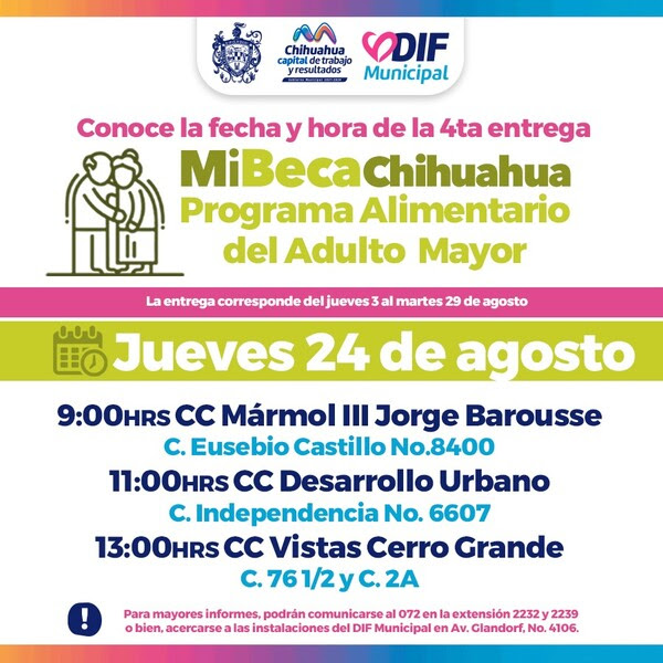 Siguiendo el compromiso del alcalde Marco Bonilla con los adultos mayores, el DIF Municipal desea informar a la comunidad que el jueves 24 de agosto, los beneficiarios del Programa Alimentario del Adulto Mayor (PAAM) podrán recoger su apoyo en diferentes centros comunitarios: