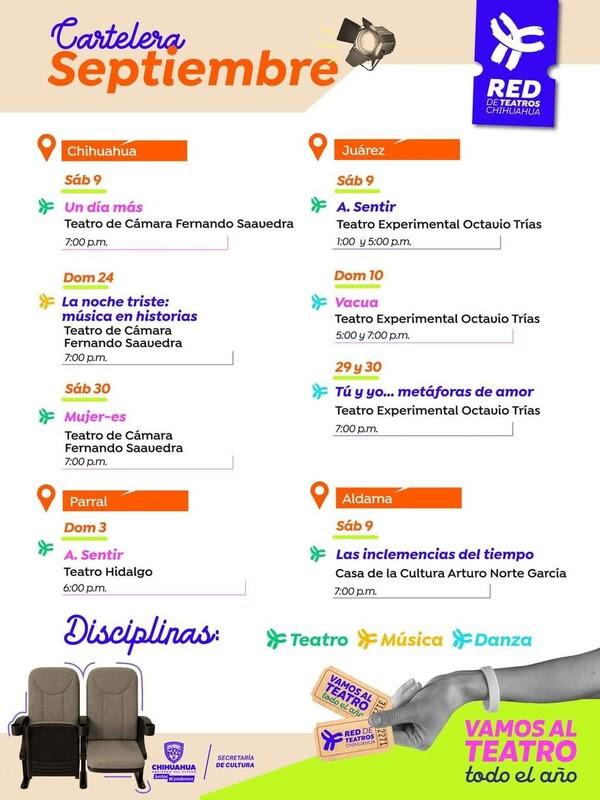 La Secretaría de Cultura te invita a disfrutar de las presentaciones que la Red de Teatros tiene preparadas para el mes de septiembre en distintas localidades como Chihuahua, Aldama, Hidalgo del Parral y Juárez.