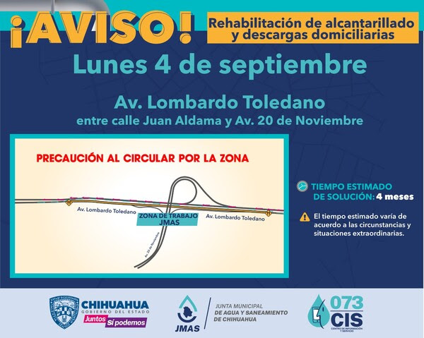 La Junta Municipal de Agua y Saneamiento (JMAS) de Chihuahua ha anunciado que a partir del próximo lunes 4 de septiembre se llevarán a cabo trabajos de restauración en una sección de 590 metros de la red de alcantarillado sanitario en la avenida Lombardo Toledano, específicamente entre las calles Juan Aldama y 20 de Noviembre.