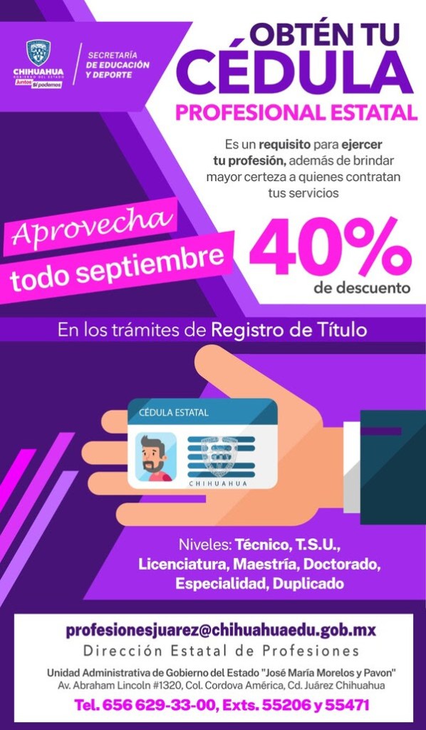 Con el fin de ayudar a los profesionales a obtener su Cédula Profesional Estatal de manera más fácil y beneficiosa, la Secretaría de Educación y Deporte (SEyD) está ofreciendo un descuento del 40% en los trámites relacionados con el registro de títulos y la emisión de la Cédula Estatal, así como la duplicación de documentos.